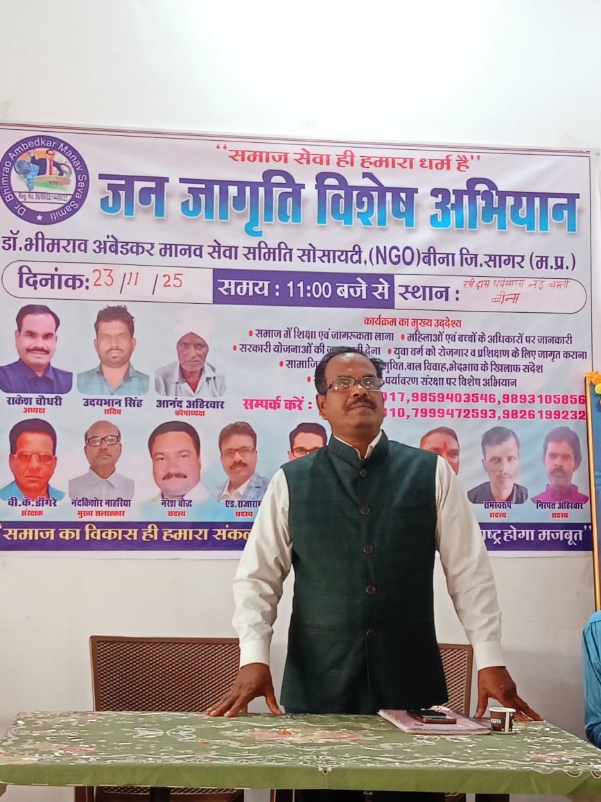 आज दिनांक 23 नवंबर 2025, दिन रविवार को डॉ. भीमराव अंबेडकर मानव सेवा समिति एनजीओ द्वारा रविदास धर्मशाला, बीना में एक महत्वपूर्ण जन-जागृति बैठक का आयोजन किया गया। बैठक का मुख्य उद्देश्य समाज के लोगों को उनके संवैधानिक हक, अधिकार और सरकारी योजनाओं की सही जानकारी उपलब्ध कराना था, ताकि समाज अधिक जागरूक होकर अपने अधिकारों का उपयोग कर सके।