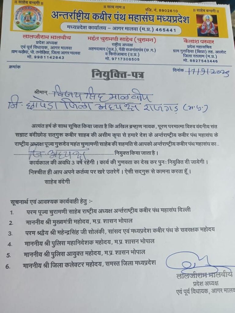 इस अवसर पर अंतर्राष्ट्रीय कबीर पंथ महासंघ के राष्ट्रीय अध्यक्ष आदरणीय गुरुदेव पूजनीय चूड़ामणि नाम साहेब एवं अंतरराष्ट्रीय कबीर पंथ महासंघ के प्रदेश अध्यक्ष आदरणीय पूर्व विधायक सम्माननीय श्री लाल जी राम जी एवं आदरणीय गुरुदेव पदम श्री से सम्मानित गुरुवर भैरू सिंह जी चौहान साहब एवं पदम श्री गुरुदेव कालूराम जी बामनिया जी के आदेश एवं उनके सानिध्य में इस दास को उसे परमपिता परमेश्वर सद्गुरु कबीर साहेब के आशीर्वाद से इस दास को अंतर्राष्ट्रीय कबीर पंथ महासंघ का राजगढ़ जिले का भर इस दास को सौंपा गया।