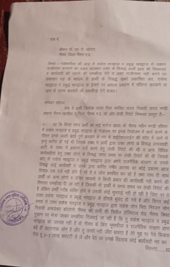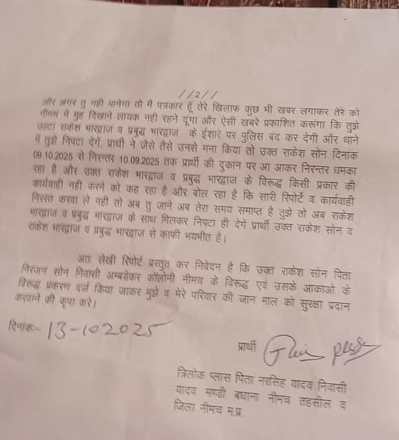 त्रिलोक ने CSP नीमच को दी शिकायत में कहा है कि एक स्थानीय पत्रकार राकेश सोन उस पर राज़ीनामा करने का दबाव बना रहा है और जान से मारने की धमकी तक दे रहा है।
