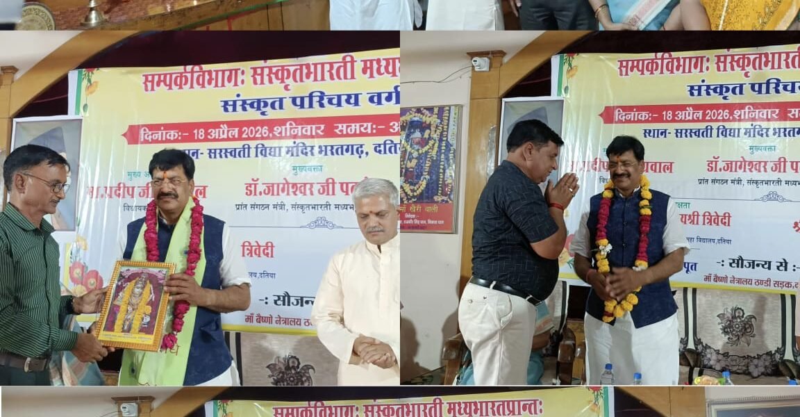 दतिया। संस्कृत भारती मध्य भारत प्रांत द्वारा आयोजित संस्कृत परिचय वर्ग का सफल आयोजन सरस्वती शिशु मंदिर विद्यालय भरतगढ़ (दतिया) में संपन्न हुआ। इस आयोजन में संस्कृत भाषा के प्रचार-प्रसार, संरक्षण एवं उसके दैनिक जीवन में उपयोग को बढ़ावा देने पर विशेष बल दिया गया।